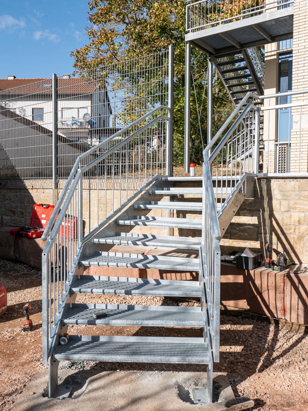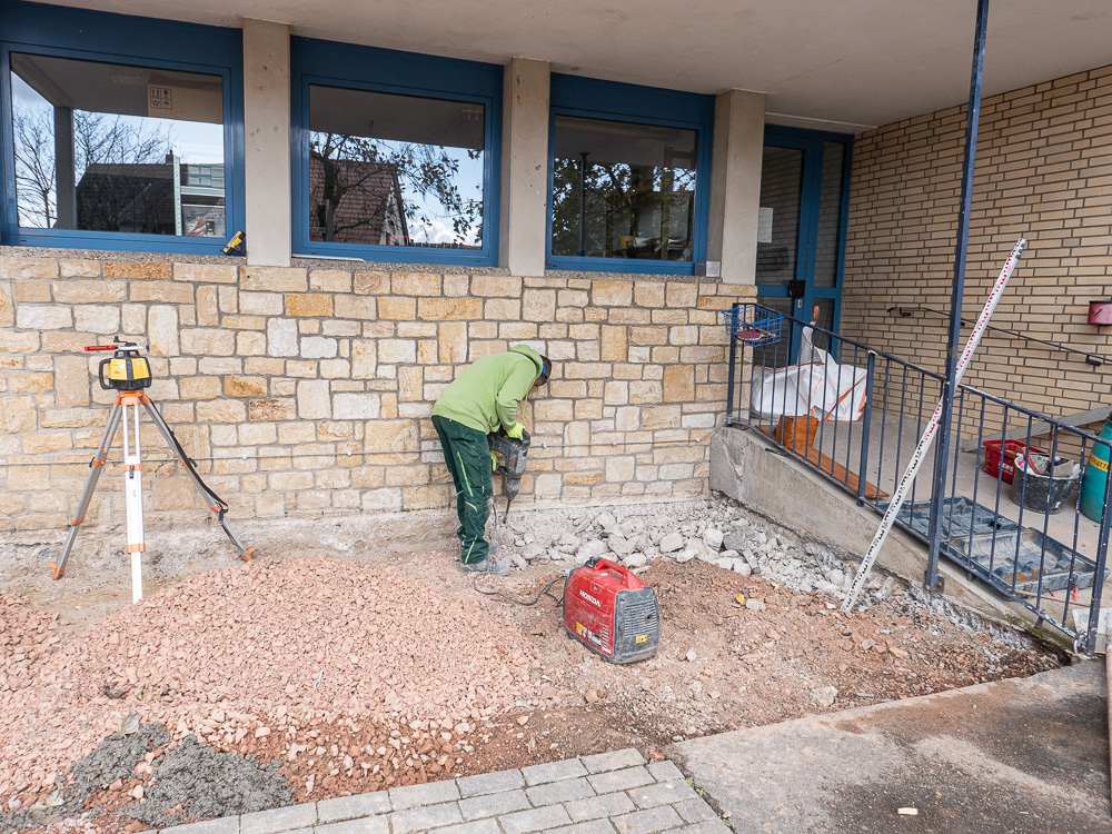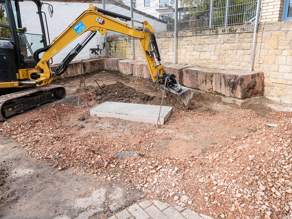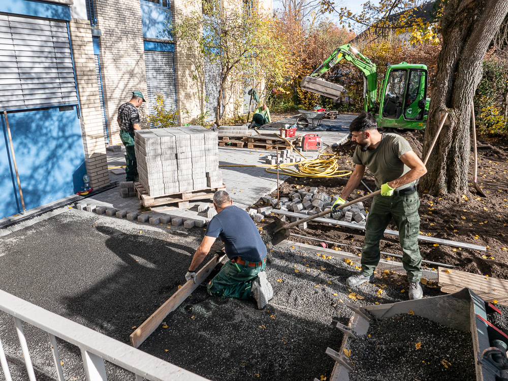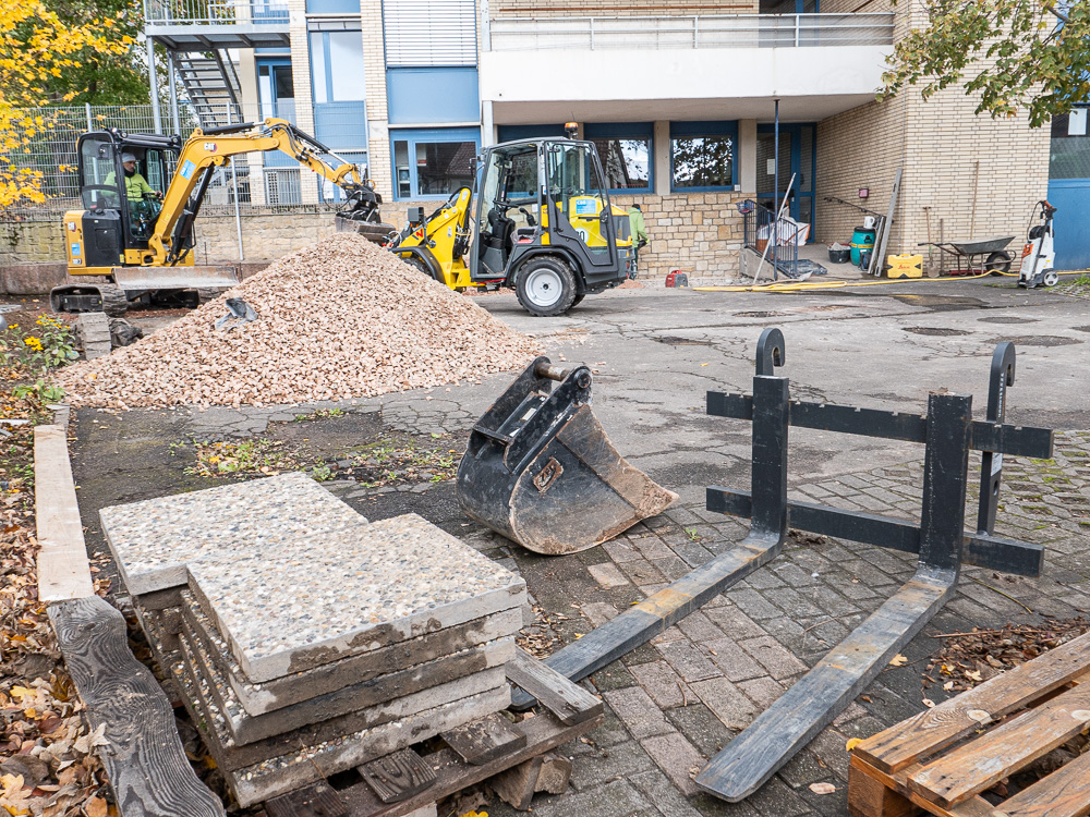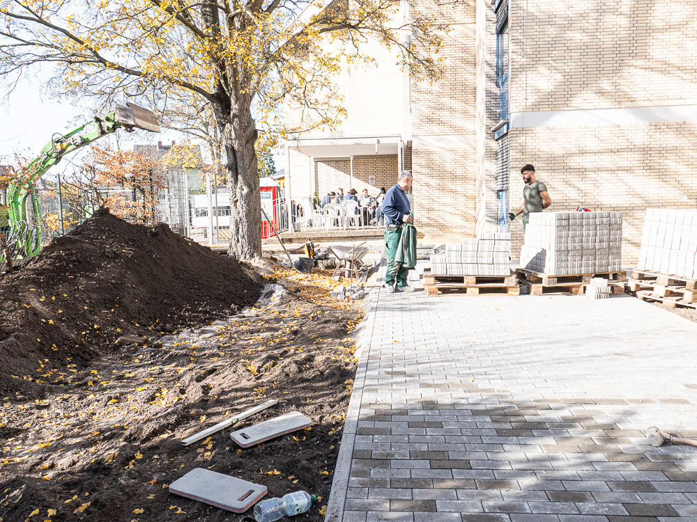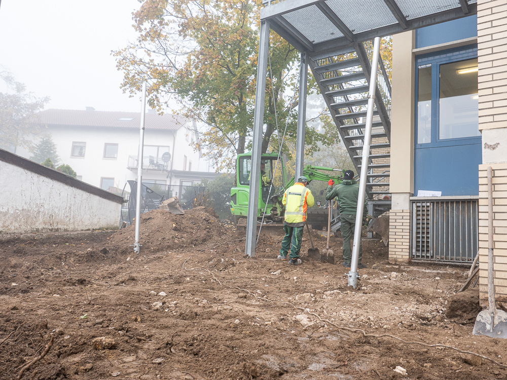 Der Umbau unseres Außengeländes schreitet voran. Tag für Tag ändert sich das Aussehen unseres Schulhofes. Immer deutlicher zeigen sich die Veränderungen und so langsam erahnen wir, wie das Endergebnis aussehen könnte. Eine stabile Metalltreppe verbindet den unteren und den oberen Hof, der versunkene Bouleplatz weicht einem gemauerten Catwalk und die überdachte Raucherecke erhält ein neues Fundament. Wir sind gespannt, was ganz am Ende dabei herauskommt.