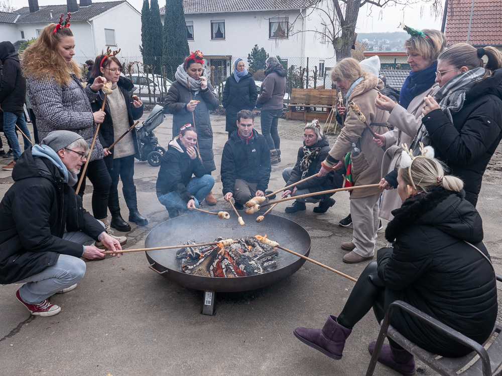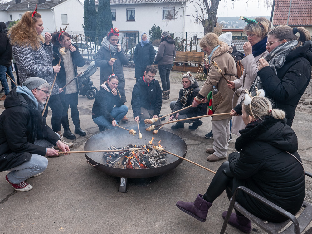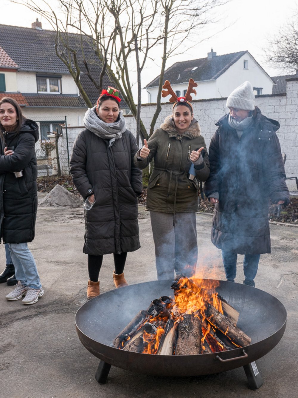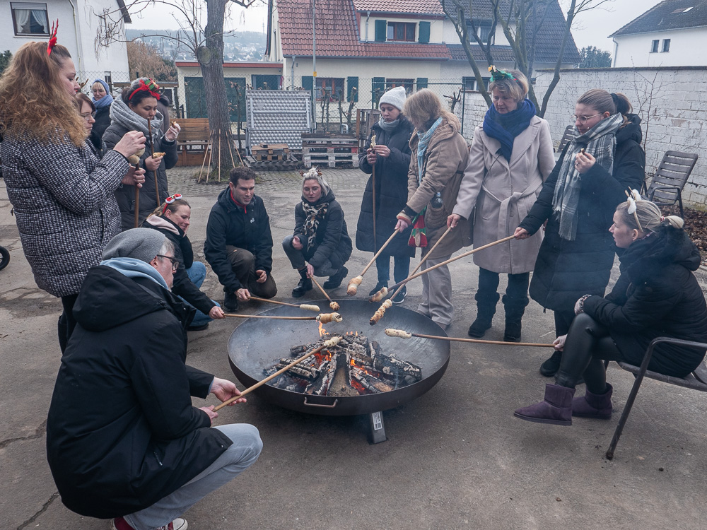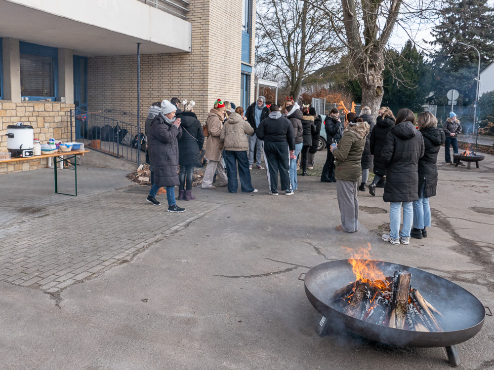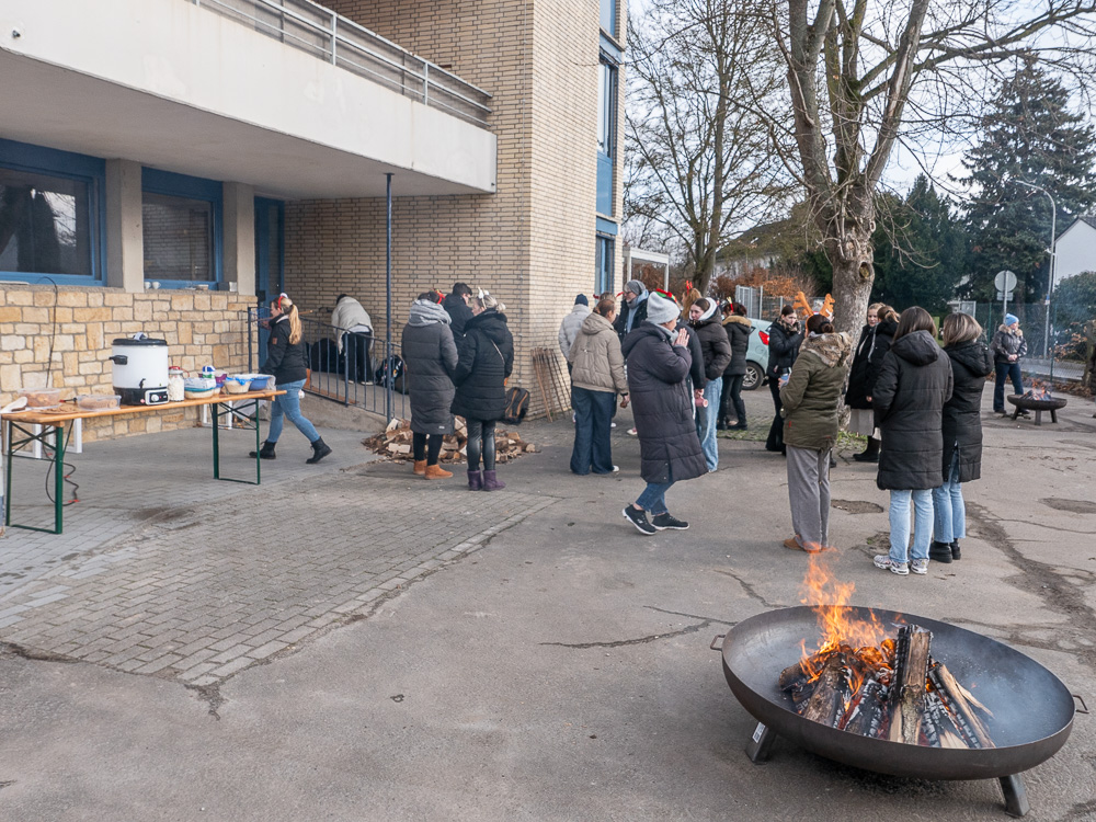 Ein Schwerpunkt unserer Schule ist die Erlebnispädagogik, was sich dieses Jahr auch bei den Weihnachtsfeiern zeigte. Draußen im Hof wurden zwei große Feuerschalen mit Brennholz bestückt. Das sah nicht nur schön aus und vermittelte ein angenehmes Flair. Es half auch gegen die vorweihnachtliche Kälte und ermöglichte unseren Schüler:innen und Lehrkräften das Erlebnis, Stockbrot selbst zuzubereiten.
