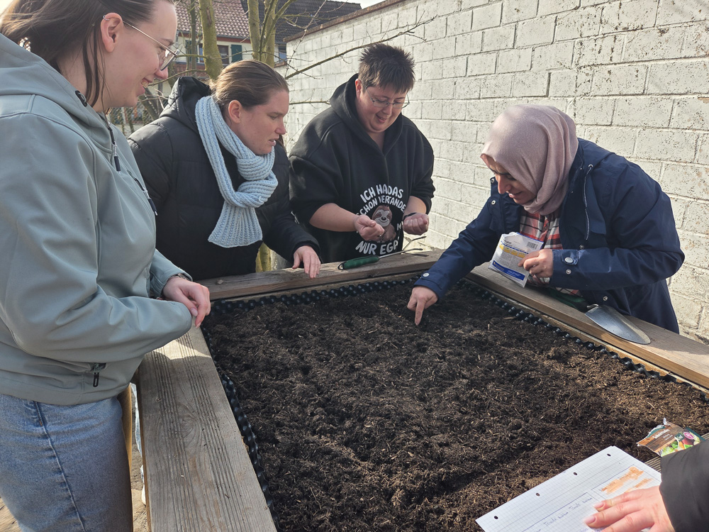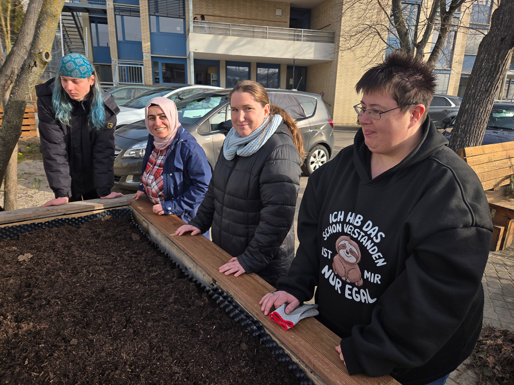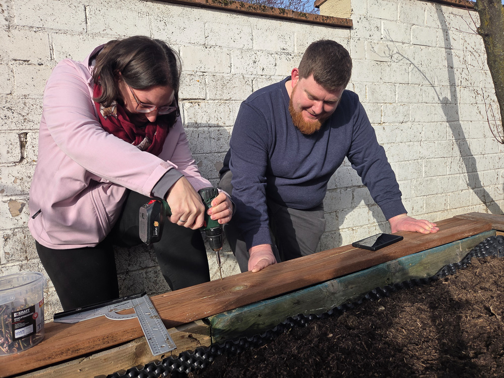 Wann immer es sich anbietet, verknüpfen wir im Unterricht die Theorie mit der Praxis. Und so kam es, dass, als es im Unterricht um Werken und handwerkliche Arbeiten ging, die Schüler:innen selbst Hand anlegen durften. Mit einigen Europaletten, ein paar Winkeln und etwas Noppenfolie zimmerten sie gleich zwei Hochbeete für unser Außengelände. Auch wenn sie noch nicht ganz fertig sind und vor allem noch die Erde und die Bepflanzung fehlen, lässt sich doch schon ahnen, dass und wie die beiden Hochbeete dauerhaft unseren Schulhof zieren werden.