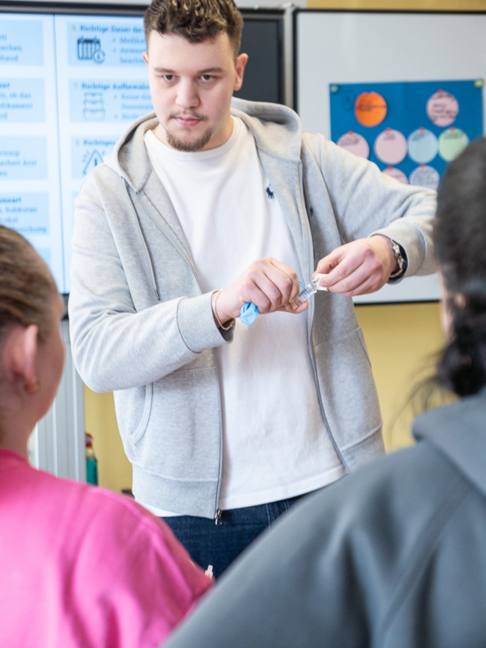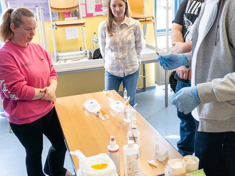 Schule ist ein Ort zum Lernen und das gilt auch für uns Lehrkräfte. Beim letzten Praxistag der Pflege fehlten krankheitsbedingt einige Lehrkräfte, weswegen die Schüler:innen der höheren Klassen einspringen und die Schüler:innen der Einstiegsklassen anleiten mussten. Das hat sich für alle Beteiligten als so positiv herausgestellt, dass wir es bei diesem Praxistag gleich als zentrales Element umgesetzt haben.