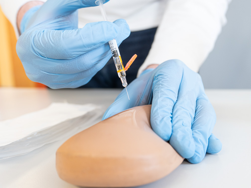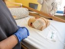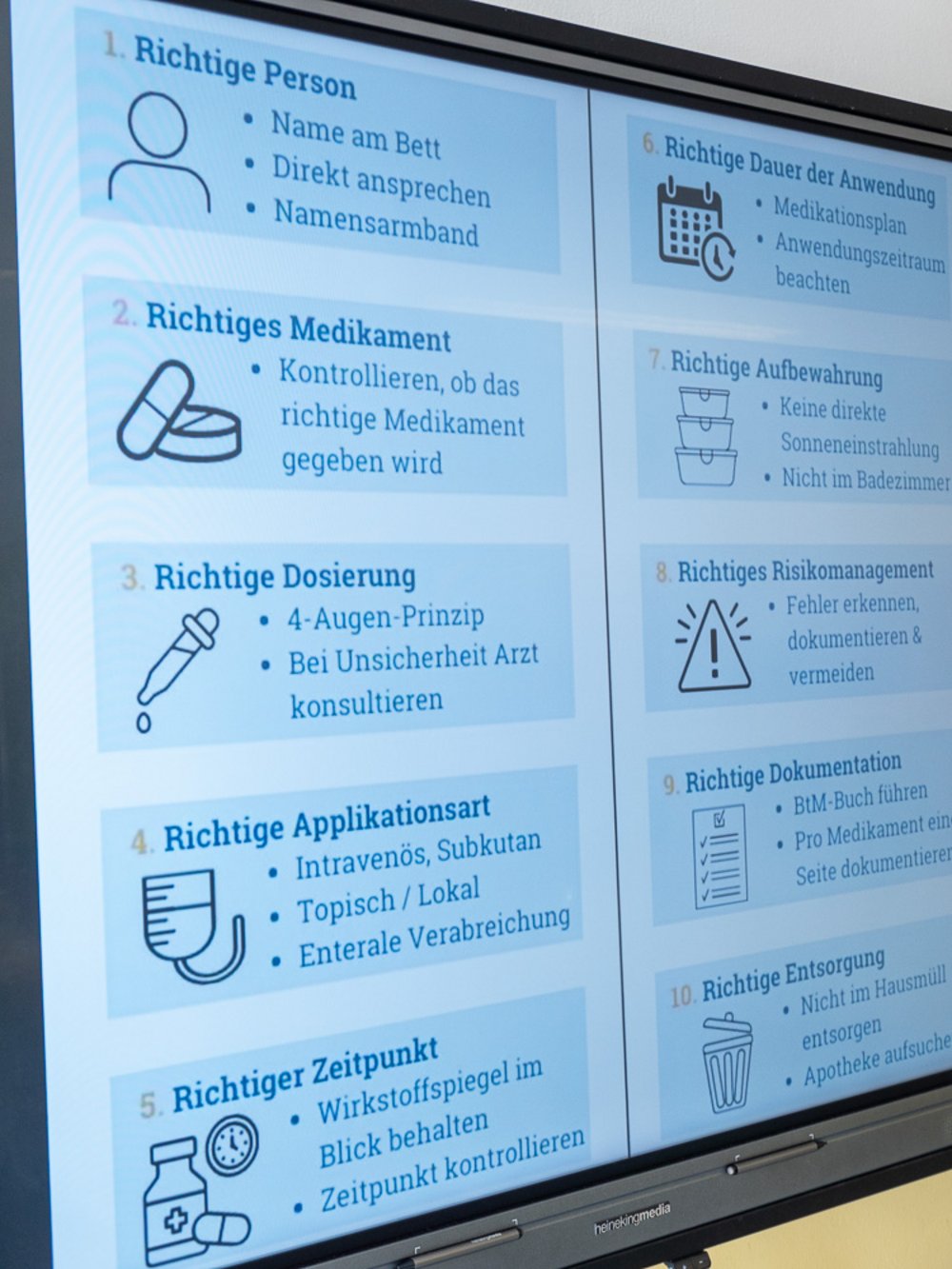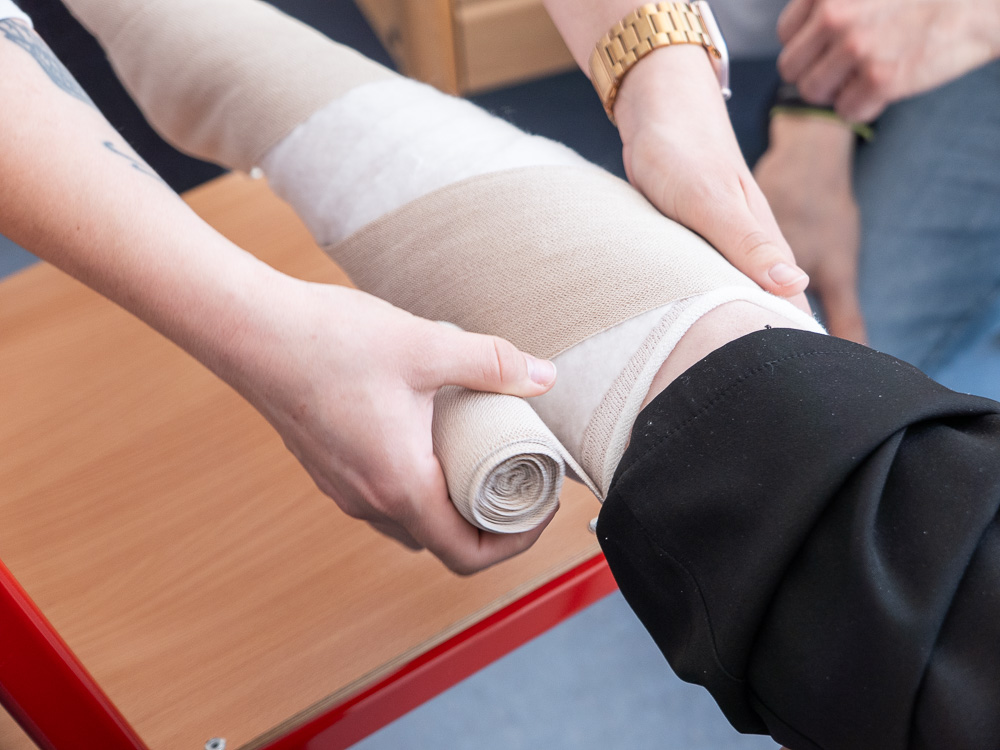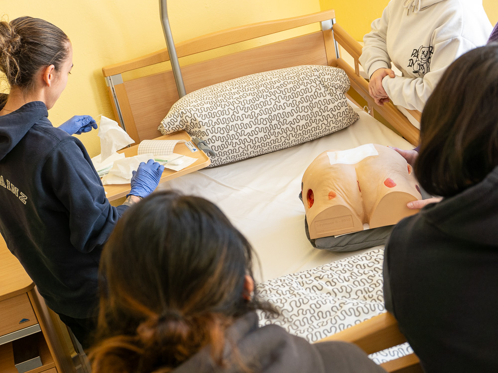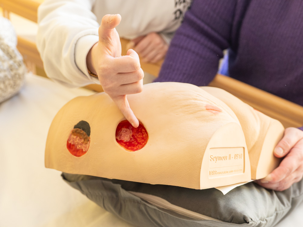 Viele Handgriffe, aber auch viel Wissen lässt sich leichter lernen, wenn man die Dinge selbst in die Hand nimmt. Und so gibt es in der Pflegeausbildung immer wieder Tage, an denen in Kleingruppen an unterschiedlichen Stationen gelernt wird, halt den Praxistag. Da werden Beratungsgespräche geprobt, Injektionen verabreicht, Verbände angelegt und mit Stützwäsche hantiert. Sowohl für die neuen als auch für die älteren Schüler:innen ein großer Gewinn.
