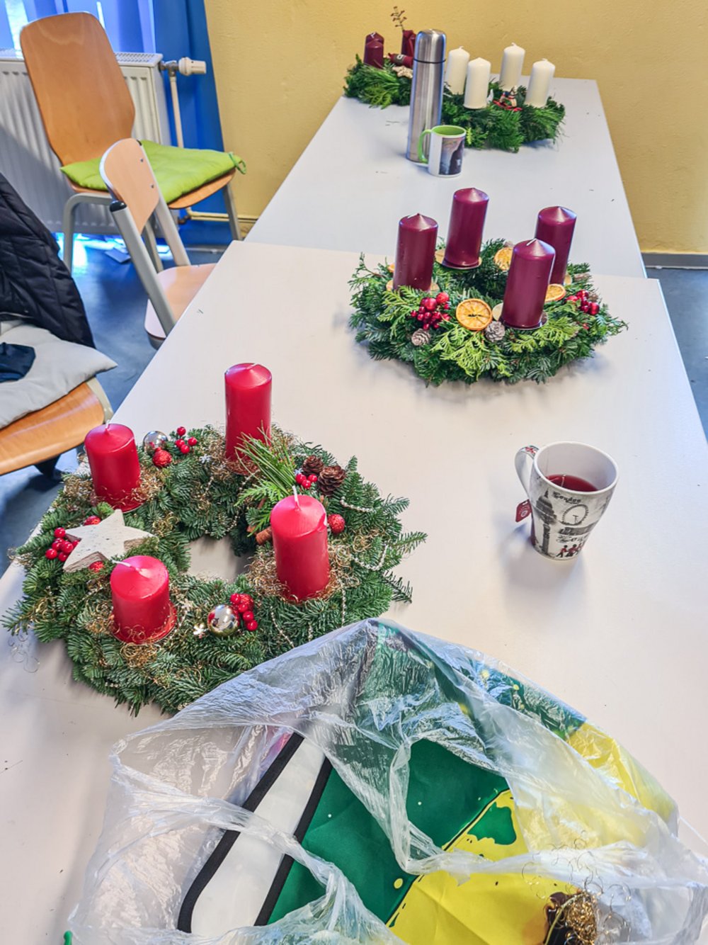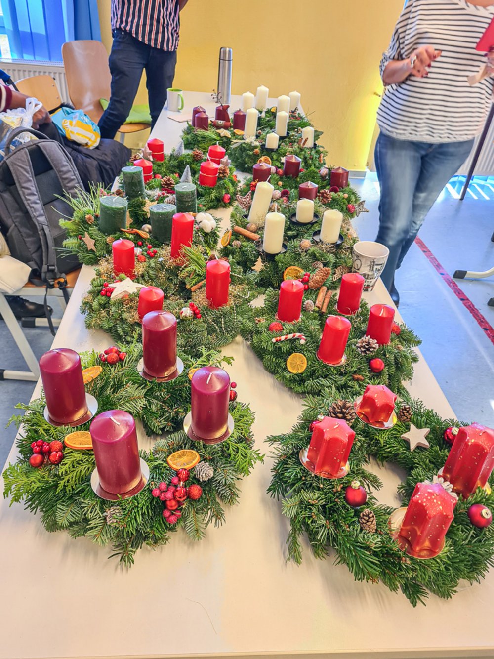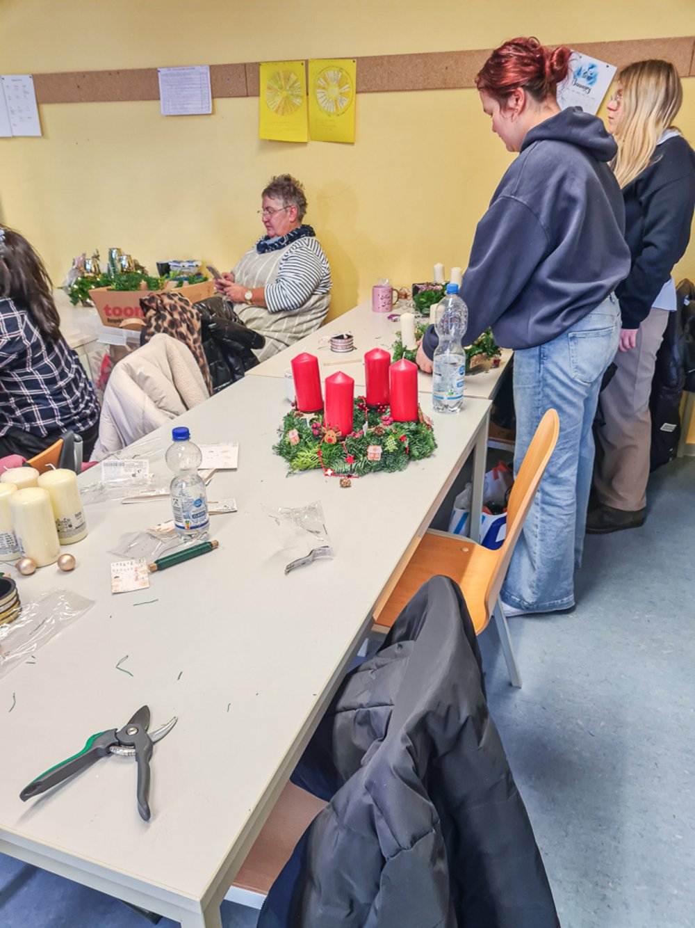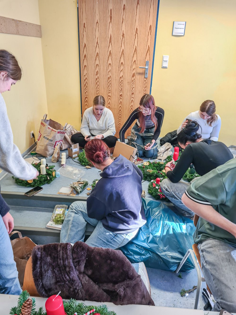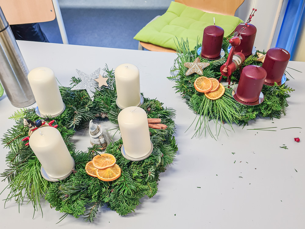 Ein Highlight in der Pflegeausbildung ist jedes Jahr wieder das Adventskranzbinden. Tannenzweige, Kerzen, jede Menge Deko und ein paar Heißklebepistolen und schon werden daraus jede Menge individueller Adventskränze. Und auch dieses Jahr lassen sich die Ergebnisse wieder mehr als sehen.