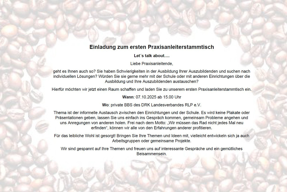 Unser Gedanke war es, den Ausbildungsverantwortlichen in den Einrichtungen eine Möglichkeit zu geben, einander kennenzulernen und gemeinsam nach individuellen Lösungen für Schwierigkeiten zu suchen, die im Rahmen der Pflege-Ausbildung immer wieder mal auftauchen. Ziel war ein informeller Austausch im gemütlichen Rahmen.